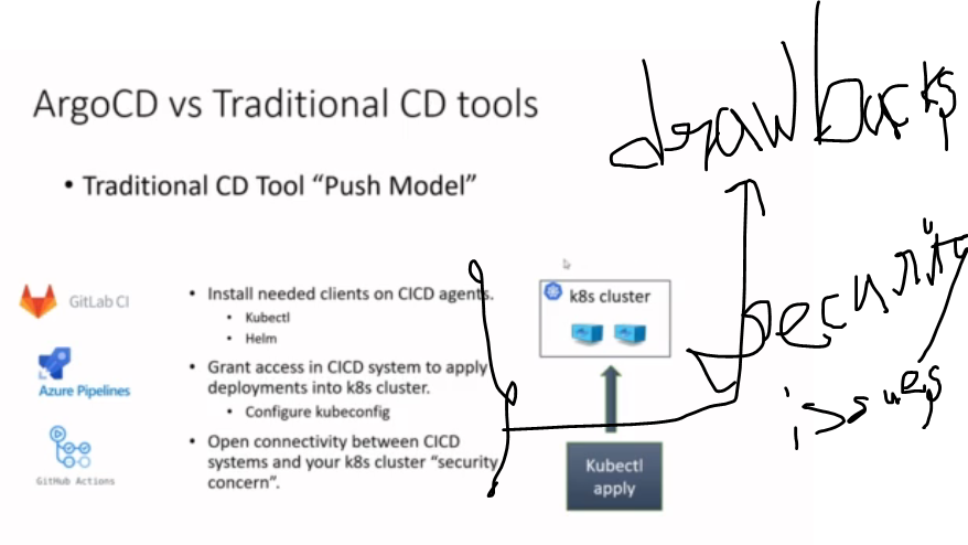 GitOps follows pull model:ArgoCD is the GitOps based CD tool with pull model design.(When ever changes happen in git will apply in destination i.e K8)